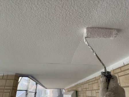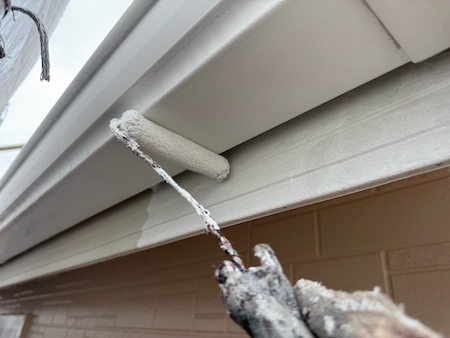 軒天の塗装から開始します。付帯部も同じように長持ちする施工を心がけます。