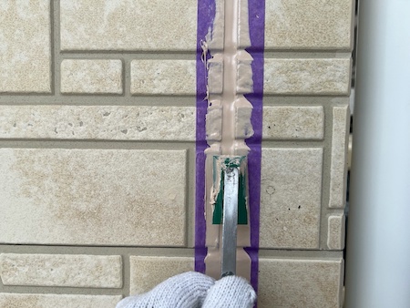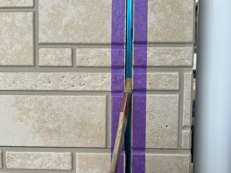 シーリングを撤去したら、きれいに仕上げるために目地にそってテープを貼り、接着剤の役目を持つプライマーを塗布します。