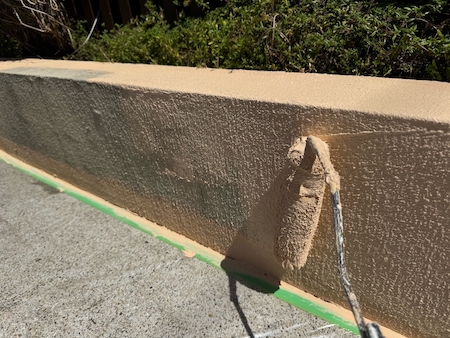雨だれ跡や汚れが目立っている擁壁も塗装します。浸透させながら下塗りからです。