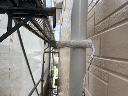 竪樋も上塗りを2回塗っていきます。一つ一つ丁寧な作業を繰り返します。