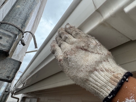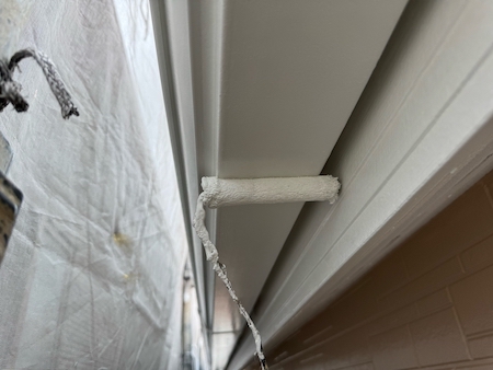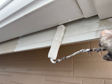 軒樋の裏側にある鼻隠しの塗装です。軒樋も鼻隠しも同時に作業を進めていきます。
