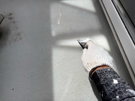 ヘラを使って突起物を取り除き、表面のザラつきを除去し施工面を整えます。