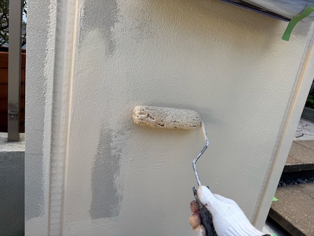 色あせている多彩柄のサイディング塗装です。下塗りからです。外壁に上塗り材の吸い込みを防ぎ、塗料を定着させます。