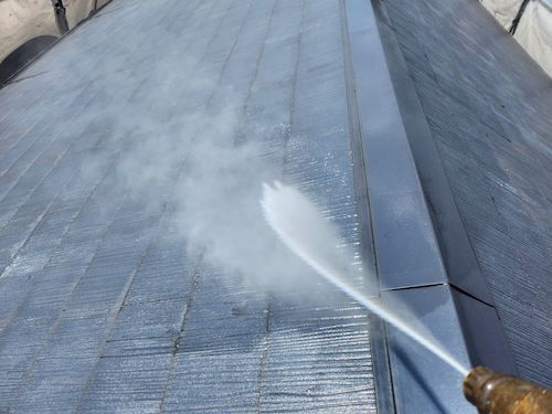 屋根の高圧洗浄です。高圧洗浄とは、業務用の高圧洗浄機を使用して付着している汚れや古い塗膜などを除去する作業です。