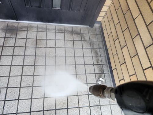玄関アプローチのタイルなど塗装しない箇所も含めて外回りも洗浄します。汚れがどんどん洗い流されていきます。