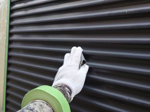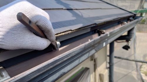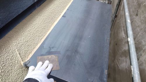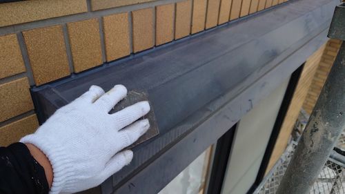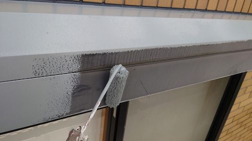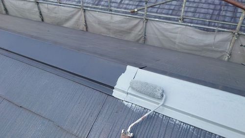 棟板金の下地処理(ケレン)後、錆止めを下塗りします。錆が発生することを予防し、密着度を向上させる効果があります。
