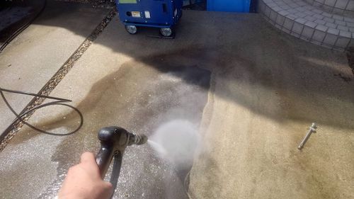土間コンクリートの洗った部分がキレイになっていることがわかりますね。スッキリ洗い上げるとリフレッシュします!