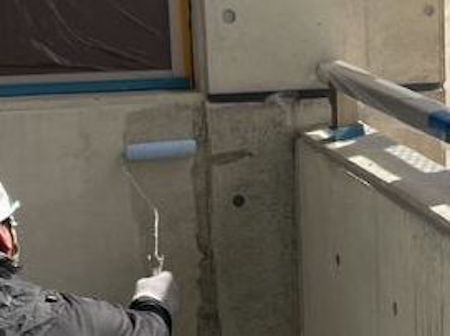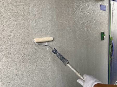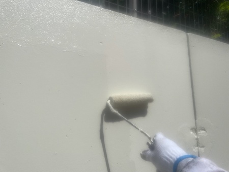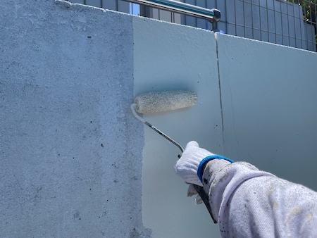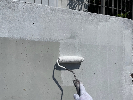 打ち放しコンクリートの自然な風合いをコンクリート調の描画工法によって再現します。密着性を向上させるプライマーを下塗りしていきます。