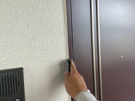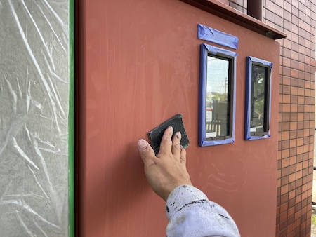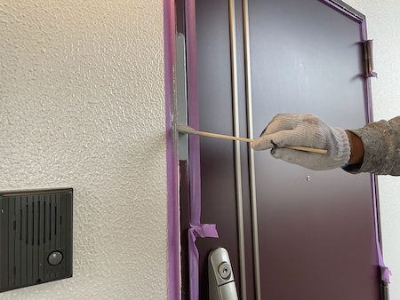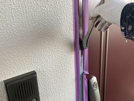 玄関ドア枠のケレン作業です。仕上がりや耐久性に差が出る塗装前の下地処理です。
