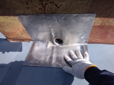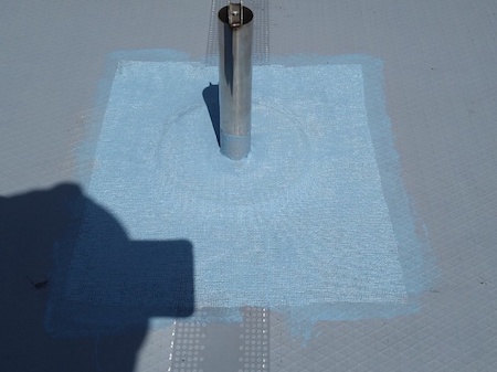 脱気筒を設置し、まわりをメッシュ補強してウレタン防水材を塗っています。下地から上がってきた湿気が、この脱気筒から抜けていくことで防水層が長持ちします。