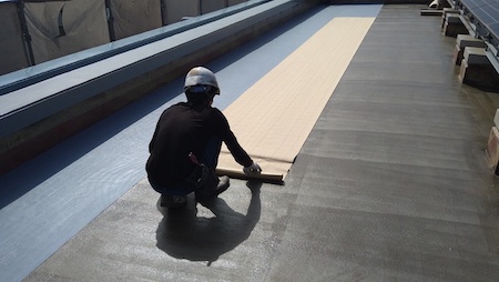通気緩衝シートを隙間なく敷き込みます。このシートが通気性を高め、建物の揺れなどによって起こるひび割れを緩衝し、防水層を守ってくれます。