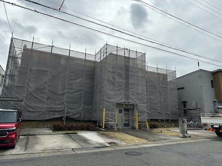 安全に作業するために足場を設置します。入居様への配慮と、洗浄の水や塗料が飛散しないようメッシュシートを取付けます。
