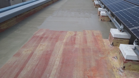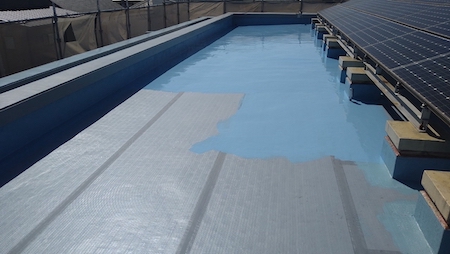 ウレタン防水の1層目です。液体状のウレタン樹脂を塗り重ねることで、つなぎ目のない防水層を形成します。