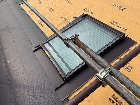 天窓(トップライト)は雨漏りしやすい箇所なので、しっかり雨仕舞します。トップライト周辺には板金を加工して取り付け、適切に排水させて雨水の侵入を防ぎます。
