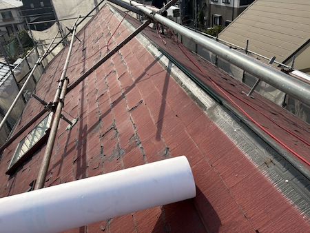 表面がハガレ、もろくなっていて、塗装は不可能なパミール屋根です。この上に軽量の屋根材を重ねるカバー工法で改修していきます。既存の棟板金を撤去し平らな状態にします。