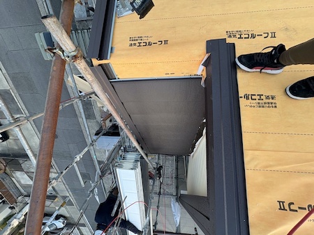 下屋根も同様に軒先から順に組み上げ、周囲に板金を取り付けます。板金を固定するための下地は木材ではなく、反りや腐食の影響がない樹脂製を使用しています。