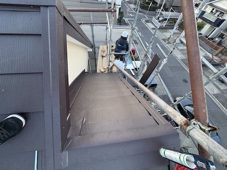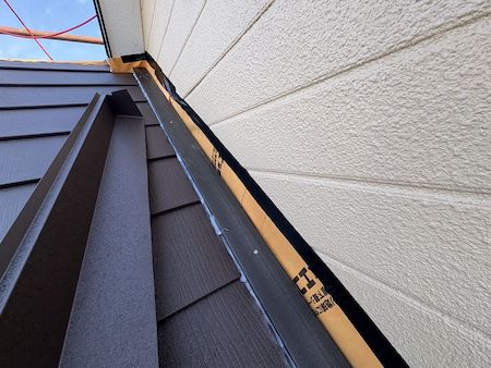下屋根と壁の取り合い部分に、雨押え板金を設置して、しっかり納めました。