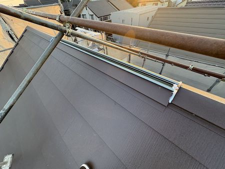 屋根の端(側面)にケラバ板金を設置しています。防水シートを固定し、雨水が内部に浸入するのを防止します。ケラバや棟板金などの部材についても保証や耐候年数に関係してくるため純正品を採用しています。