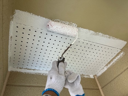 下塗り2回目です。下塗りを1回塗装しただけでは中塗り・上塗り材が定着しない可能性がある場合、工程を増やし対応します。