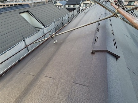 屋根の頂部です。屋根裏にこもる湿気や熱気を排出させる換気棟を設置しています。