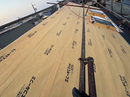 屋根は、パミール屋根でありました。塗装をしてもミルフィーユ状に中から剝がれてしまうため、現状の屋根の上から軽量かつ耐候性に優れた金属屋根を葺く「カバー工法」にて施工しています。