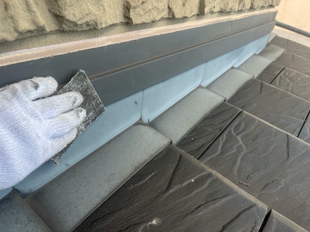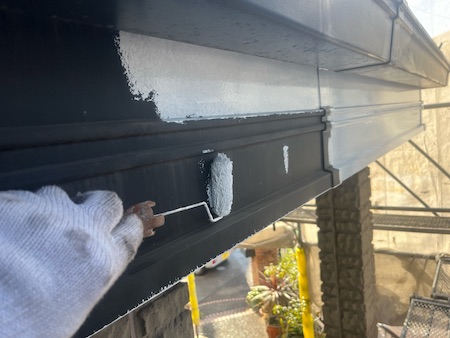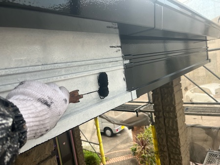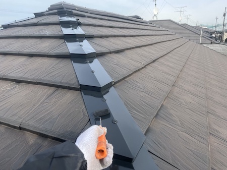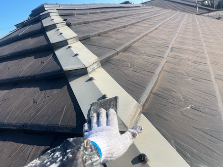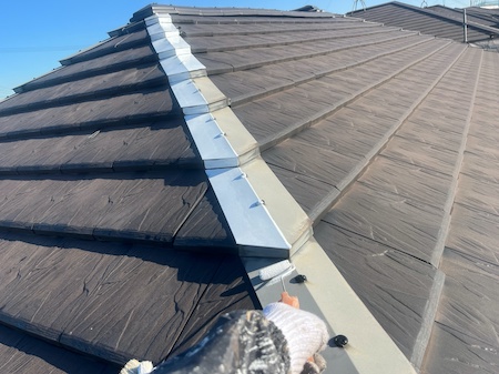 また、屋根は瓦ですが、棟や雨押え部分に板金が使用されていました。板金部分は塗膜が劣化すると錆が発生しやすいため、塗装を施し保護しています。