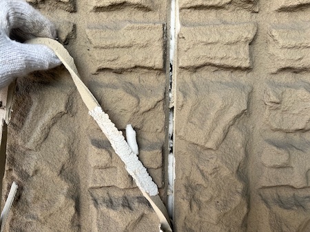 外壁の目地シーリングを引っ張りながら撤去しているところです。古いシーリングが残らないよう、きれいに撤去して、新しいシーリングに打ち替えていきます。