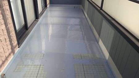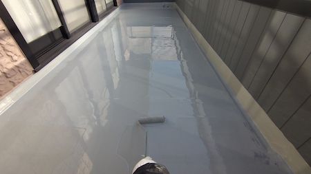 ウレタン塗膜2層目を施工して、既定の厚みを持たせます。この厚みが耐久性を大きく左右します。最後にトップコートを塗布したら、ベランダ防水工事の完了です。