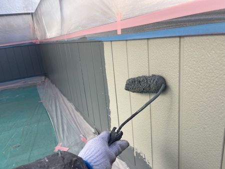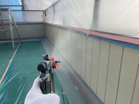 ベランダ内壁の塗装です。こちらも下塗りを吹き付け塗装していきます。