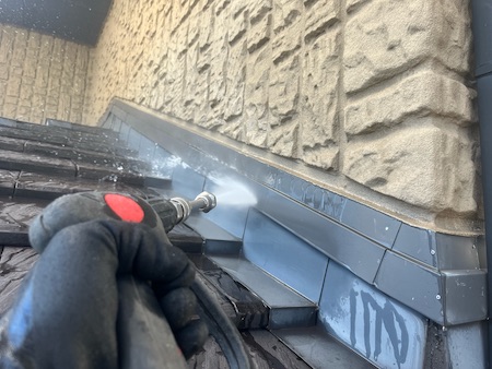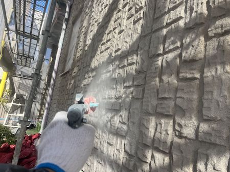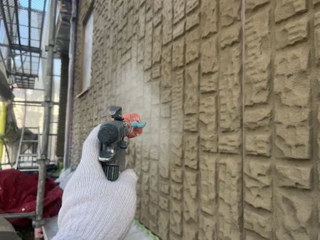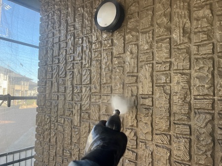 次に高圧洗浄です。凹凸が深い外壁の場合、特に凹んだ部分に汚れが溜まりやすいため、時間をかけて丁寧に洗浄します。