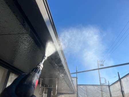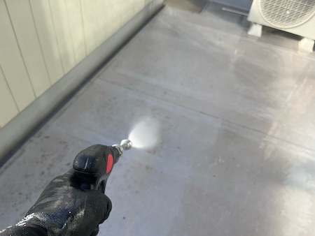 業務用の高圧洗浄機から水を噴射させ、その圧力によって表面に付着した汚れや古い塗膜をきれいに落としているところです。