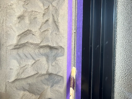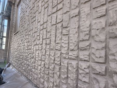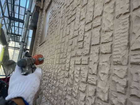 下塗り吹き付け2回目です。凹凸があるため、塗り残しがないよう細部まで確認しながら慎重に作業していきます。