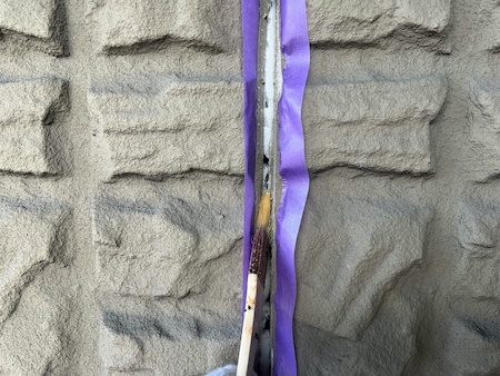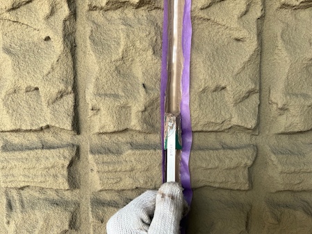 シーリングをきれいに仕上げるため、外壁の目地に沿ってマスキングテープを貼り、接着剤の役目を持つ専用のプライマーを塗布します。