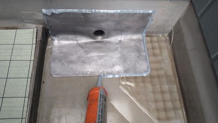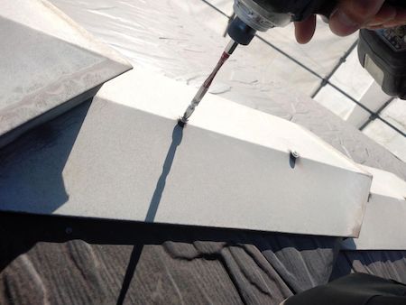 板金を固定しているビスの浮き上がりを締め直します。そのあとシーリングを充填してフタをすることで、ビスの抜け防止や微細な雨水の侵入を防ぎます。