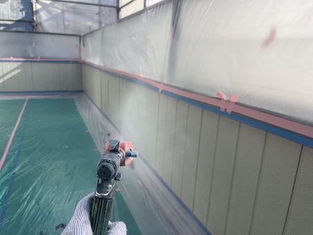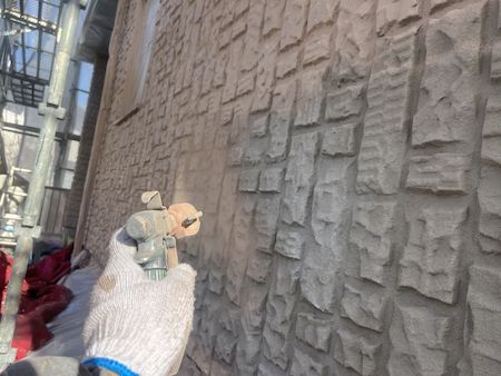 上塗りです。吹き付け塗装によって、凹凸のある外壁でも塗料がムラなく付着し、均一な厚さの塗膜が形成されます。