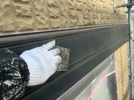 下屋根と壁の取り合い板金です。錆や古い塗膜を削り落とし、表面に塗料が密着しやすくなるよう細かい傷をつける作業です。