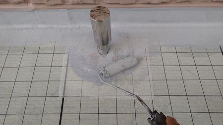 ウレタン塗膜の1層目です。液体状のウレタン樹脂を塗り重ねることで、つなぎ目のない防水層を形成します。塗り継ぎがでないよう均一に塗り広げていきます。