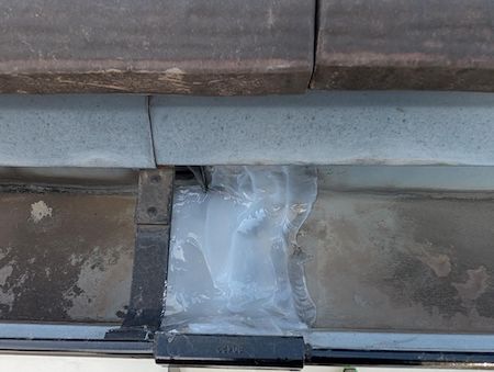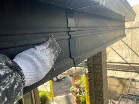 軒樋の内側に補修材を充填して、つなぎ目箇所を補修していきます。