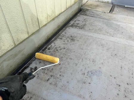 湿気を逃がす通気緩衝工法にて、ベランダのウレタン防水工事を行います。接着性を高めるプライマーを塗布していきます。
