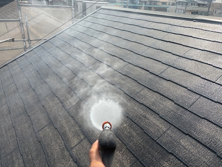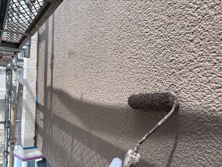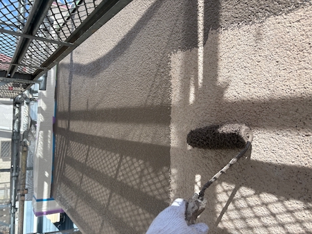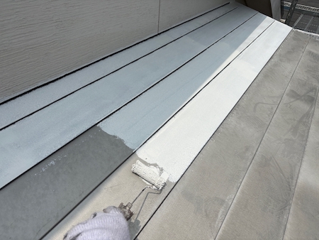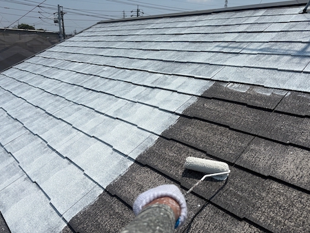 傷んでいる屋根は塗料を吸い込んでしまう性質があるため、今回は下塗り2回塗ります。状態により工程を増やし対応します。