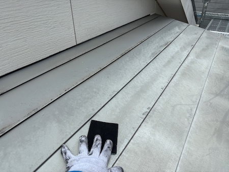 金属屋根のケレンです。サビや古い塗膜を削り落とし、表面に塗料が密着しやすくなるように細かい傷をつける作業です。