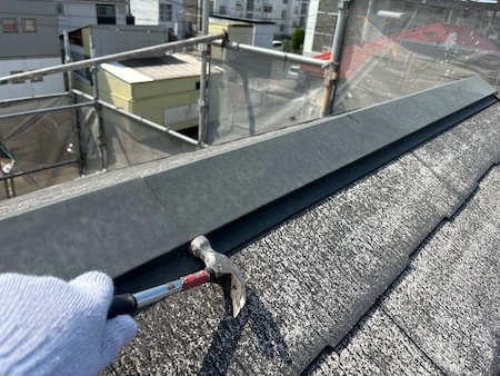 板金を固定している釘の浮きを打ち直します。その後シーリングを充填しフタすることで抜けの防止や雨水の侵入を防ぎます。
