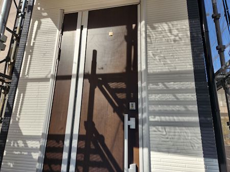 玄関部分は塗料の色を変え、ツートンカラーに塗り分けます。下塗り乾燥後に中塗りを塗布していきます。