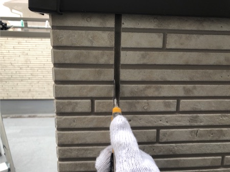 目地シーリングを撤去して、新しいシーリングに打ち替えていきます。カッターナイフでシーリングに切れ目を入れています。