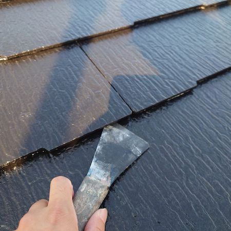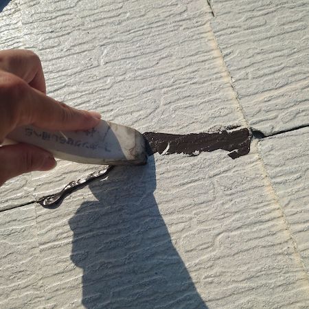 スレート屋根の破損箇所は、ひび割れに沿ってシーリングを充填して補修し、ヒビの広がりを防ぎます。