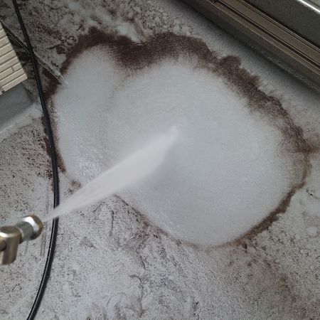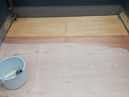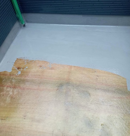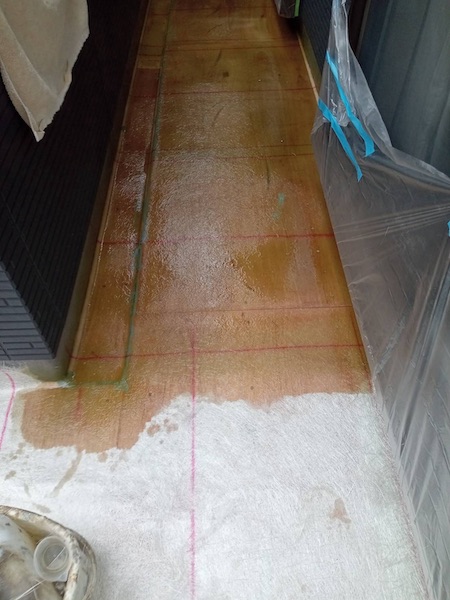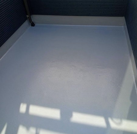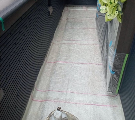 塗装工事に使用した塗料は、プレマテックス社のウルトラSiになります。通常のシリコン塗料以上の耐候性を持ち、水性塗料のため施工中の臭気が少なく、環境にやさしいSDGsに即した塗料です。また、ベランダ防水面では立ち上がり部分の劣化が激しいため、現状の防水層をはがし、施工しております。床面にコンパネを新しく敷いて、FRP防水工事を行うことで防水層が長い間効果を果たします。