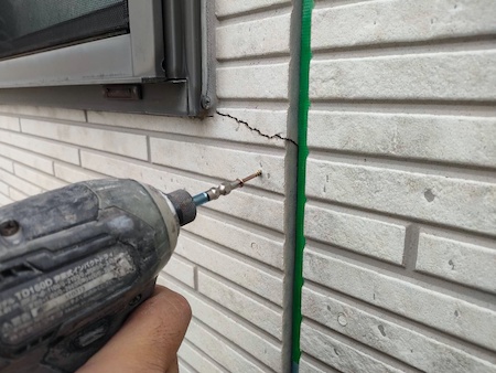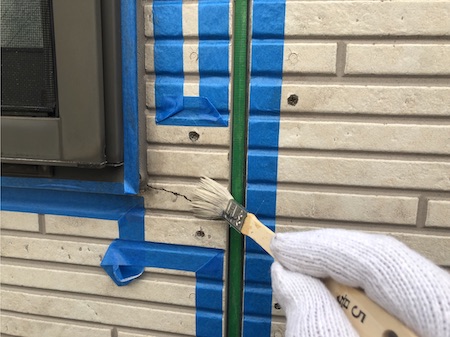 シーリングをきれいに仕上げるため外壁の目地に沿ってテープを貼り、接着剤の役目を持つ専用のプライマーを塗布します。