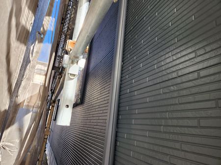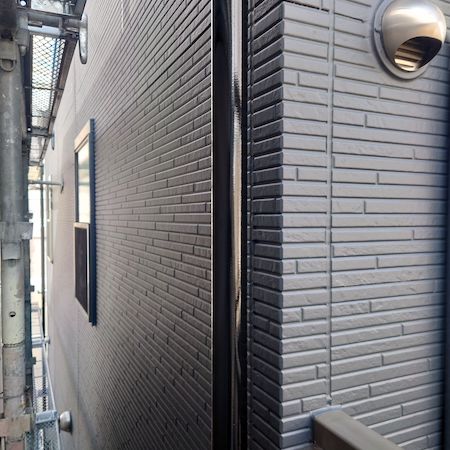 さらに上塗りするとクールな外壁に生まれ変わりました。凹凸模様の陰影感と黒に近いグレー色が美しい表情となっています。