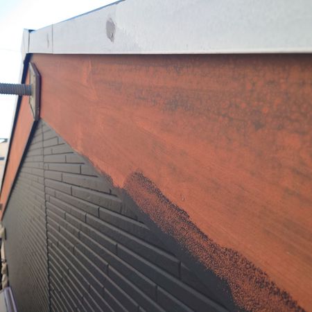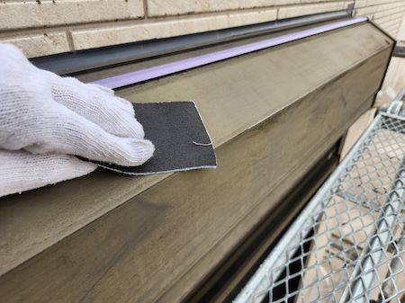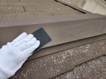 屋根板金のケレンです。サビや古い塗膜を削り落とし、表面に塗料が密着しやすくなるよう細かい傷をつける作業です。