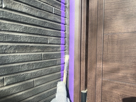 シーリングをきれいに仕上げるため外壁の目地に沿ってテープを貼り、接着剤の役目を持つ専用のプライマーを塗布します。
